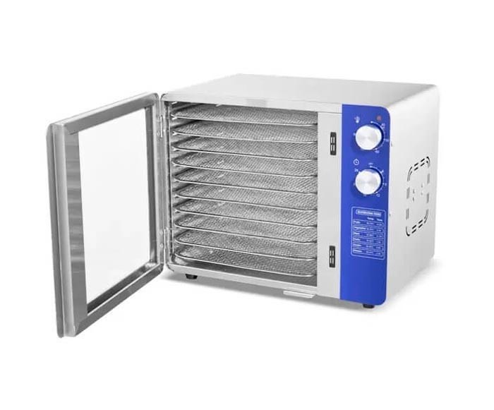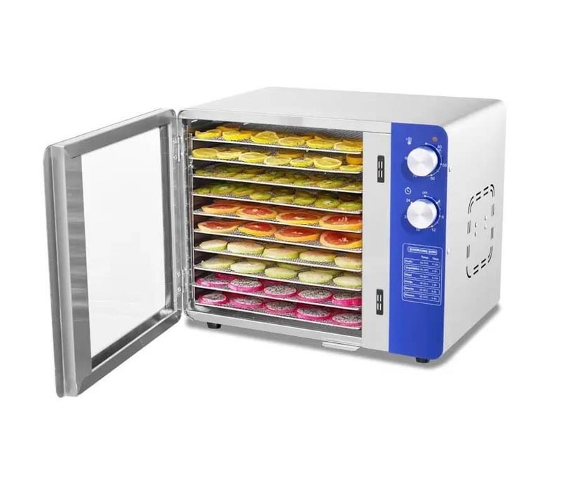У моделі DH-10M-SS нагрівання відбувається за рахунок нагрівальних елементів, а вентилятор розподіляє гаряче повітря всередині камери горизонтально, забезпечуючи рівномірне сушіння продуктів.