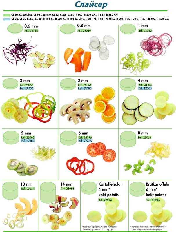 Сумісний з овочерізки: CL50, CL50 Gourmet, CL50 Ultra, CL52, CL55, CL60 і кухонними процесорами R502, R652.