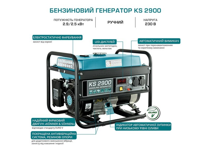 Бензиновий генератор Konner&Sohnen KS 2900 служить як резервне джерело електричного струму для забезпечення електроенергією заміського будинку, офісу, підприємства на будівництві.