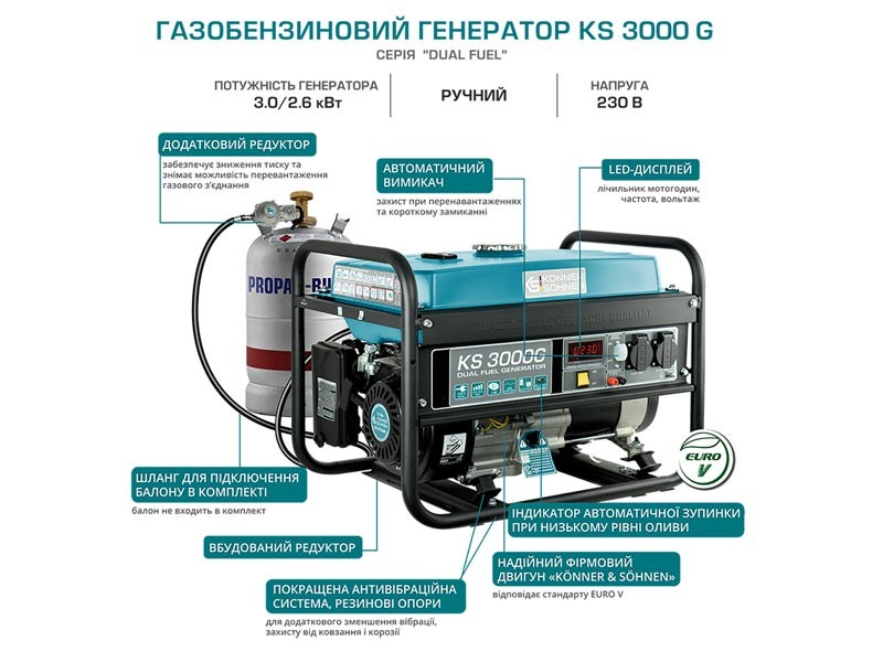 Газобензиновий генератор Konner&Sohnen KS 3000G серії DUAL FUEL можна використовувати як на бензині, так і на зрідженому газі (пропан-бутан). Експлуатація генератора на газі підвищує двигун двигуна. Все необхідне для підключення балона йде у комплекті.