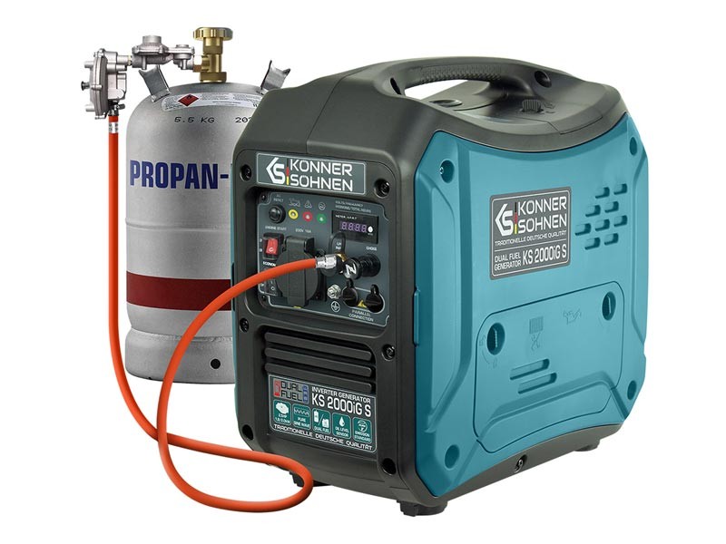 Інверторний газобензиновий генератор Konner&Sohnen KS 2000iG S у шумозахисному кожусі можна використовувати як на бензині, так і на зрідженому газі (пропан-бутан). Експлуатація генератора на газі підвищує двигун двигуна. Все необхідне для підключення балона йде у комплекті.