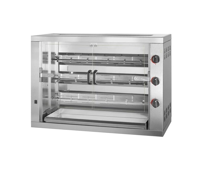 Велика продуктивність: три рожни забезпечують можливість обсмажити до 18 курей одночасно – ідеально для потужних кухонь та масового виробництва.