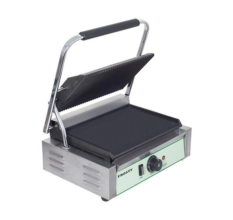 Притискний гриль FROSTY SP-1C2 або як його ще називають гриль-тостер або контактний гриль використовується для приготування паніні, шаурми, гамбургерів, стейків, хот-дога, булочок. Притискний Гриль-тостер SP-1C2 дозволяє розігріти та нанести на продукт малюнок гриля у вигляді піджаристих смужок, які залишають поверхню притискного гриля.