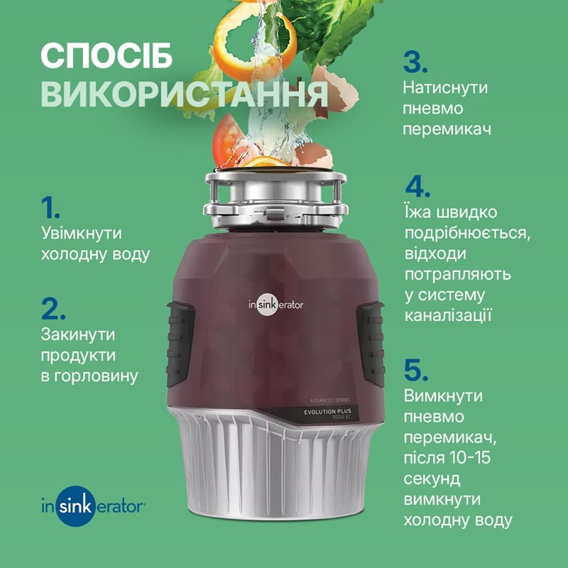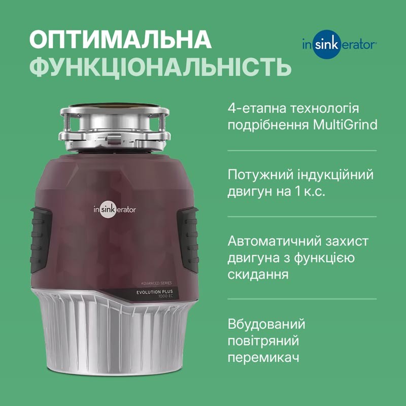 InSinkErator Evolution Plus 1000 — це поєднання потужності, тиші та інновацій. Він значно спрощує повсякденне життя на кухні, роблячи процес утилізації відходів швидким, безпечним та екологічним.