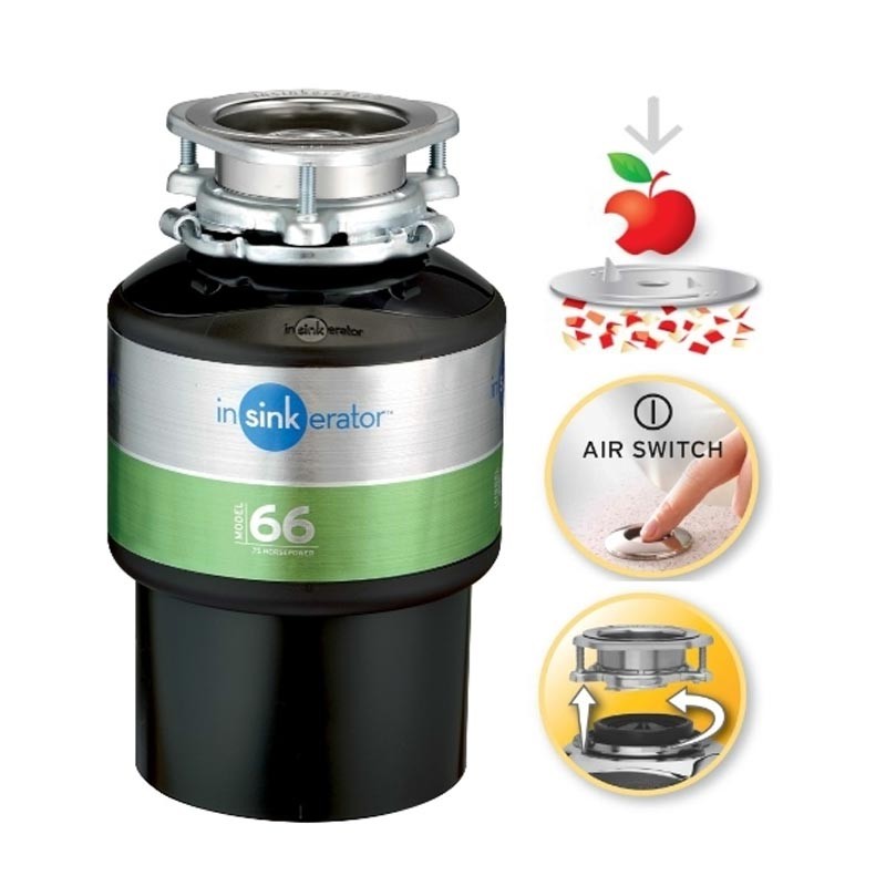 Диспоузер IN-SINK-ERATOR Model 66 встановлюється під зливним отвором раковини і допомагає подрібнювати та утилізувати такі відходи як невеликі кістки, рибні кістки, яєчну шкаралупу, шкірку, що носить водою, та відходи від фруктів та овочів.