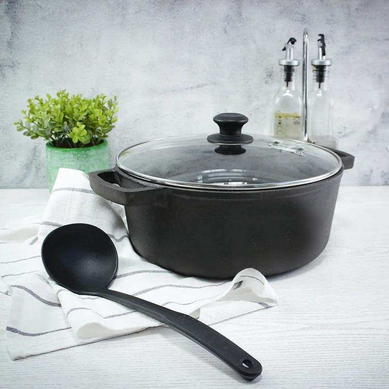 Традиційна чавунна каструля Brizoll P-4L-6, об'ємом 4 л, використовується для приготування м'ясних, рибних та овочевих страв.
