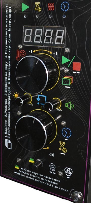 Цифровий дисплей відображає всю актуальну інформацію: температуру всередині котла з кроком 0,5 С (можливо і встановлену температуру), режим роботи, час роботи або час роботи (з можливістю побачити і встановлений час), потужність нагрівальних елементів в % від номінальної, можливі помилки чи неправильні натискання органів управління.