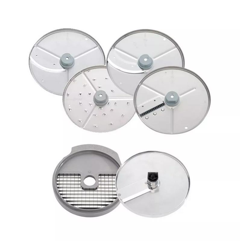 6 дисків: слайсер 2 мм. та 4 мм., терка 2 мм., соломка 4x4 мм., комплект для нарізування кубиками: 10 мм. + грати 10x10 мм.;