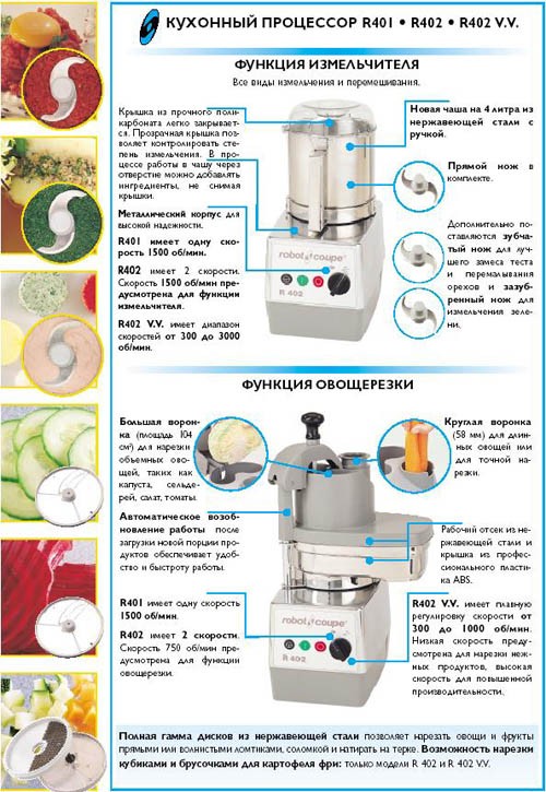 В буклеті Кухонний процесор Robot Coupe R402 висвітлено такі питання: комплектація, технічні характеристики, порівняння моделей
