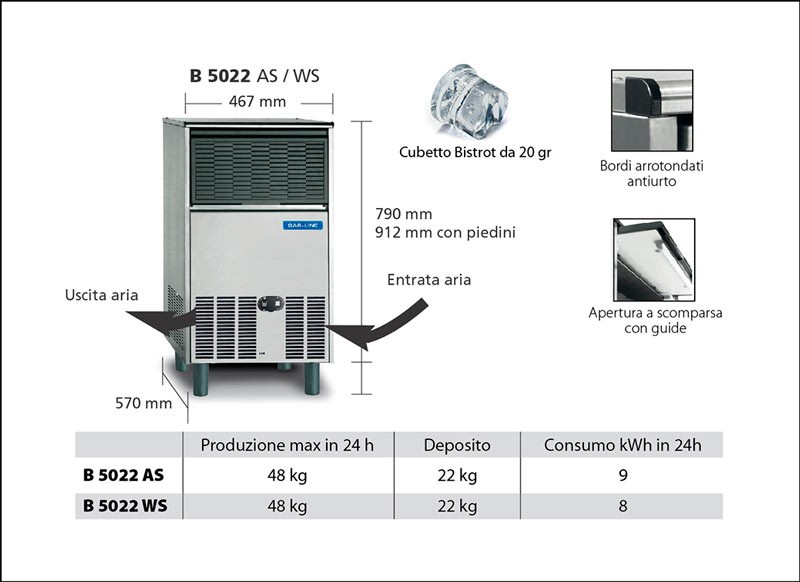 Льдогенератор BAR LINE 5022 AS використовується в барах, ресторанах готелях, кафе для приготування кубикового льоду Bistrot.