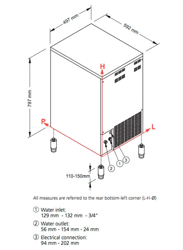 Для монтажу льодогенератора необхідні підведення (вентиль 3/4″) та відведення холодної води (стік d 24 мм).