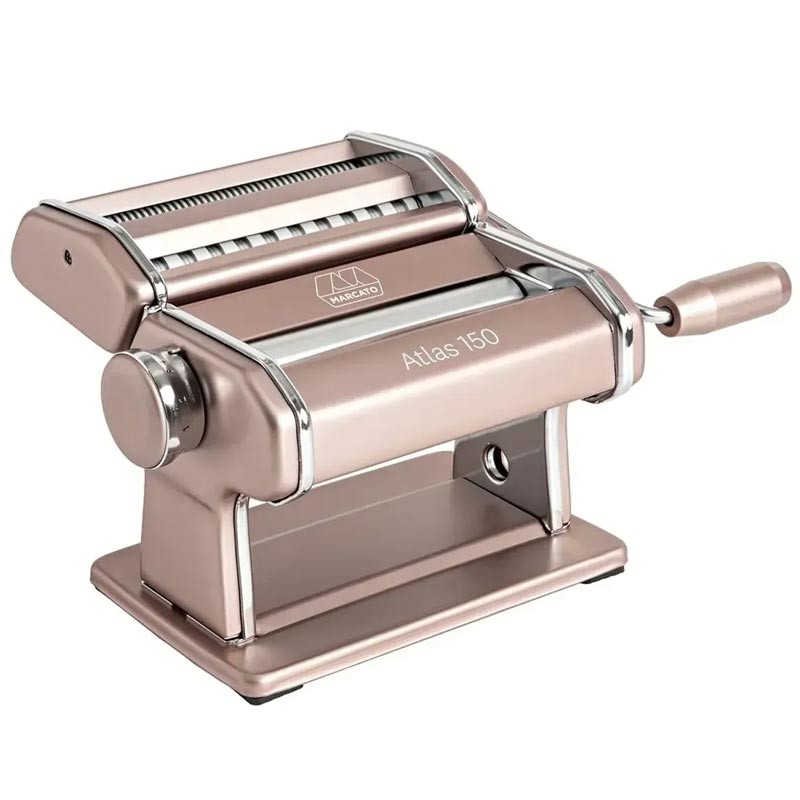 Marcato Atlas 150 Powder Pink – це італійська тісторозкатка-локшина для будинку, створена для ідеальної розкочування тіста потрібної товщини і нарізування локшини. Машинка нарізує два види локшини: фетучіні шириною 6,5 мм., тальоліни - 1,5 мм. та плоску широку пасту 150 мм
