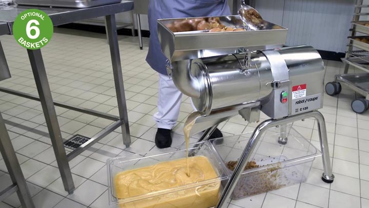 Протиральна машина (автоматичне сито) Robot Coupe C 120 служить для приготування пюре з ягід, м'яких та печених фруктів та овочів, соусів, супу гаспачо, м'якого морозива, сорбетів, пастили, швидкого проціджування супів-пюре та морсів.