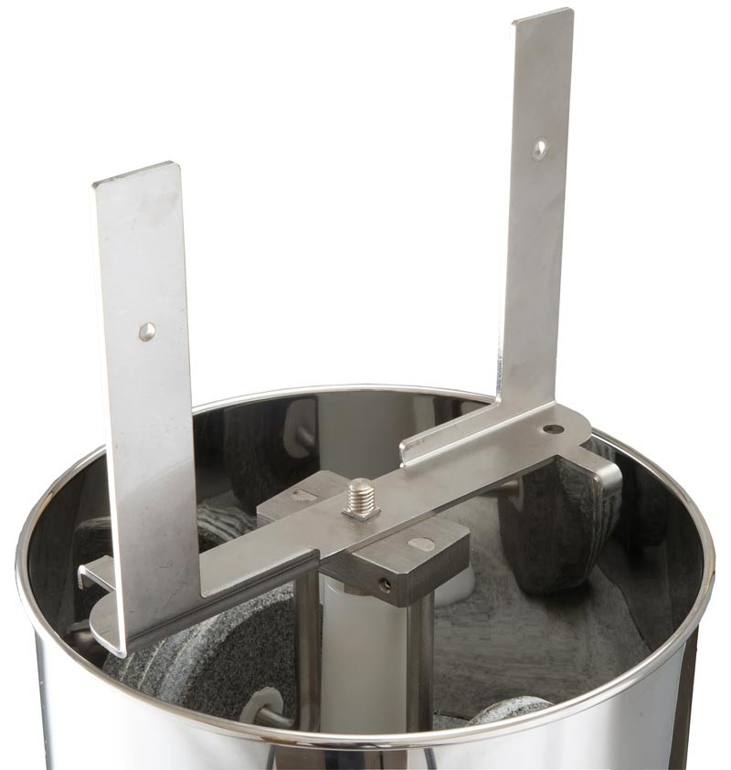 Апарат оснащений двома роликовими каменями, виготовленими з натурального граніту, і має дві лопаті дефлектора. Система подвійного дефлектора забезпечує більш ефективну обробку, оскільки вона поступово спрямовує суміш під кам'яні колеса, скорочуючи час виробництва. Система подвійного дефлектора також створює найкращу аерацію/коншування, особливо для приготування шоколаду.