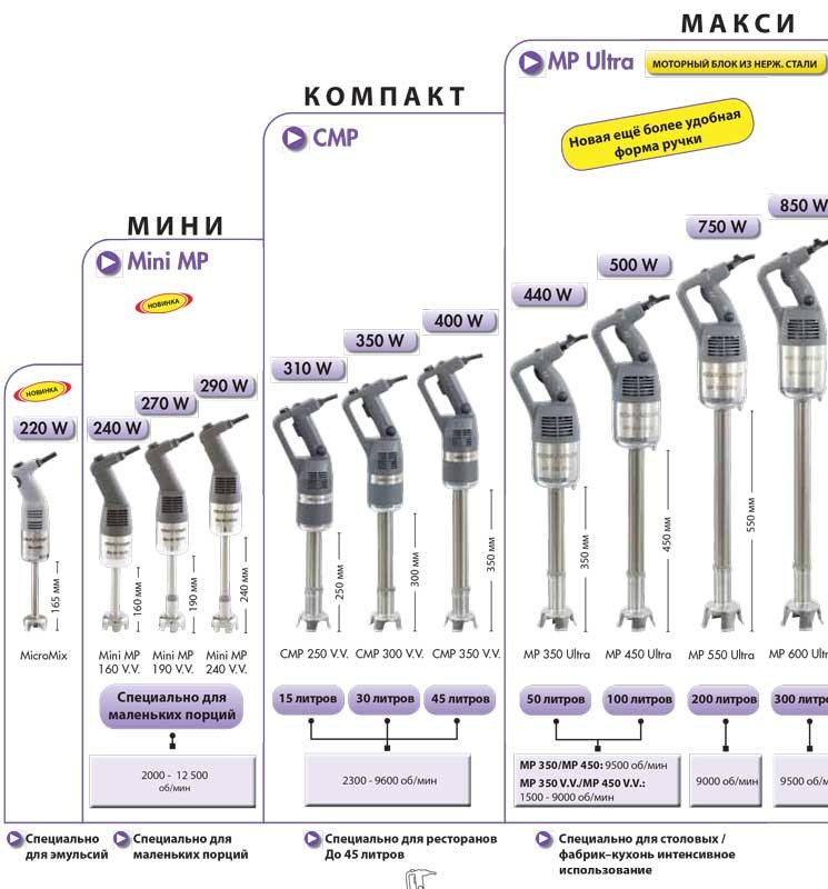 У буклеті Ручні міксери Robot Coupe висвітлено такі питання: застосування, технічні характеристики, опис, переваги, порівняння моделей