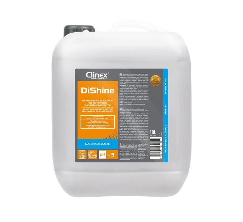 Концентрований засіб Clinex DiShine служить для ополіскування та полірування посуду у професійних посудомийних машинах.