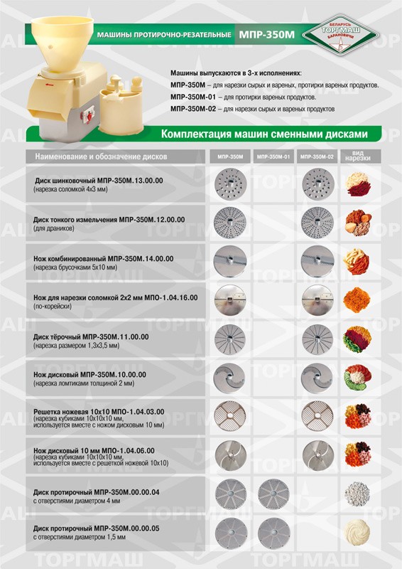 МПО-1 - для нарізки сирих та варених овочів, терки картоплі та моркви, протирання варених продуктів (базове виконання) з повним набором робочих дисків для різання (6 найменувань) та пристроїв для різання та протирання;
