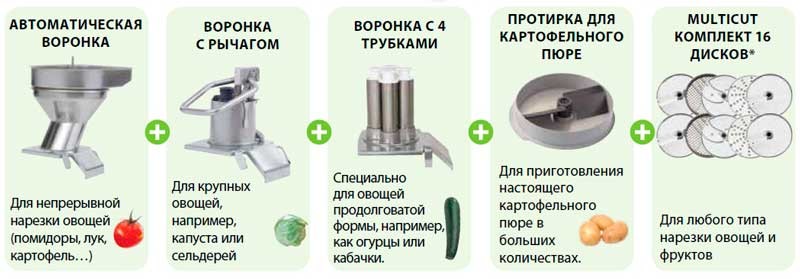 Автоматична вирва для роботи з більшим завантаженням та швидкістю підходить для нарізування ніжних продуктів, таких як гриби або томати, а також для терки моркви та нарізування соломкою, кубиками та брусочками фрі.