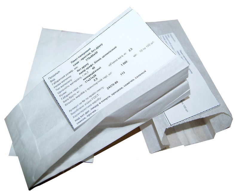 Пакет саше з білого харчового крафта без малюнка для хот дога, горішок, насіння, Панін, снеків.
