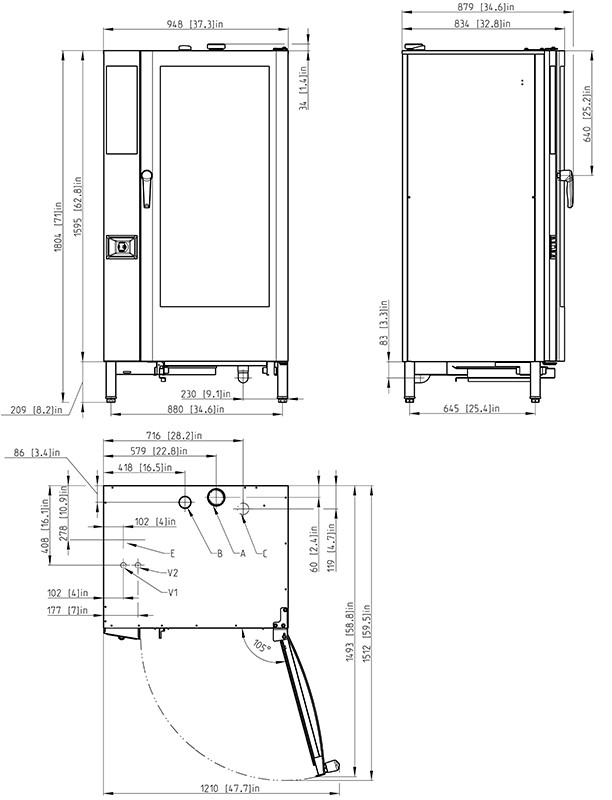 Відстань від бічних стінок пароконвектомата до інших пристроїв, меблів або стін повинна становити не менше 0,2 м.