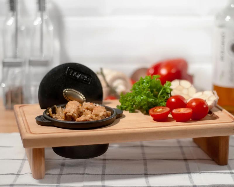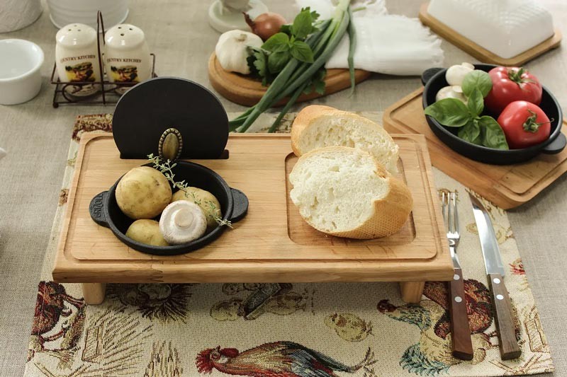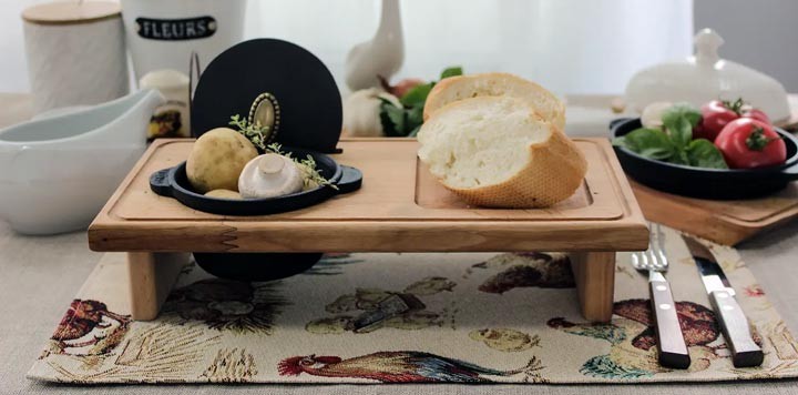 Підставка зроблена з вільхи, має отвори для встановлення самої каструльки, а спеціальне поглиблення розраховане на серветку, хліб, столові прилади.
