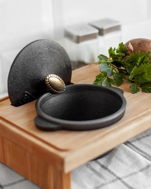 Чавунна міні каструлька з дерев'яною підставкою Brizoll H03-D, об'ємом 0,35 л, найчастіше використовується для порційної подачі страв у ресторанах. У порційній каструлі можна приготувати м'ясні, рибні страви, овочі, жульєн, омлет. Тобто все, що передбачає подачу в гарячому вигляді.