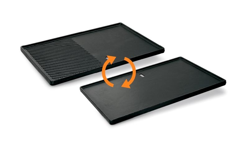 Двостороннє чавунне деко 1/2 з гладкою гриль-майданчиком, рифленою поверхнею та отвором для стікання жиру. Застосовується у газових грилях Enders Monroe Pro 4