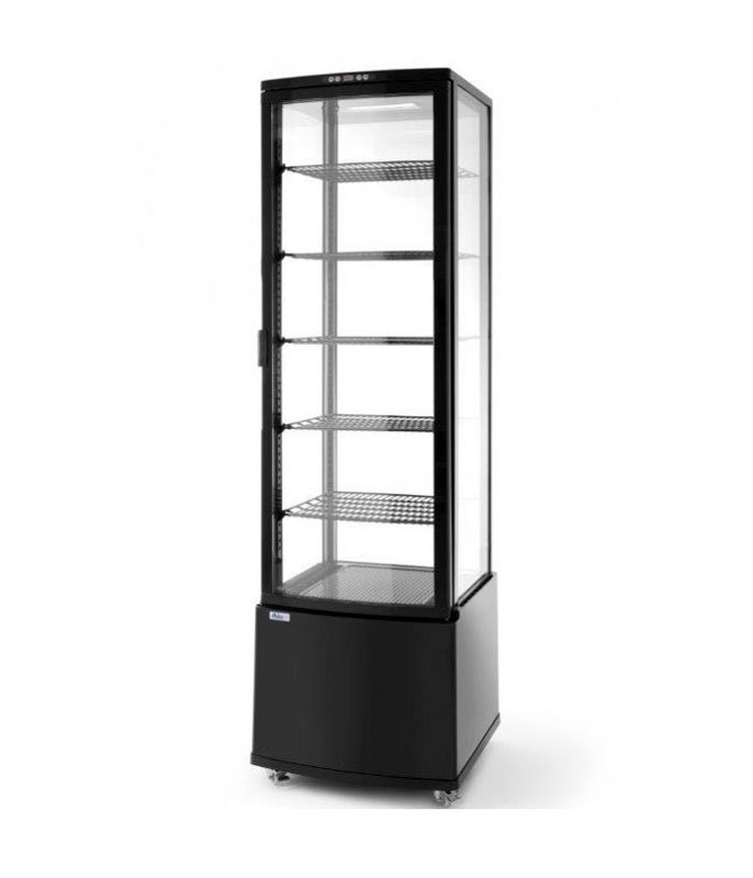 Демонстраційна холодильна вітрина FL288 чорна зі світлодіодним підсвічуванням та чудовим оглядом з чотирьох сторін гарне рішення для демонстрації та продажу продуктів та напоїв.