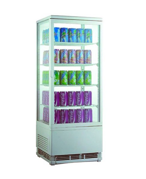 Демонстраційний холодильна вітрина RT98L-1D White зі світлодіодним підсвічуванням та чудовим оглядом з чотирьох сторін гарне рішення для демонстрації та продажу продуктів та напоїв.