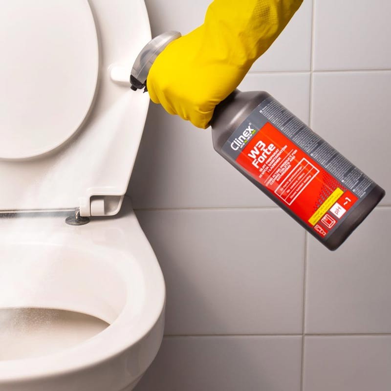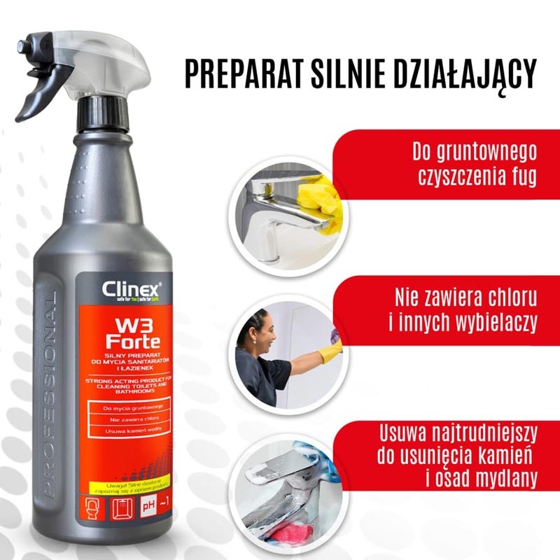 Кислотний засіб Clinex W3 Forte служить для ретельного очищення стійких забруднень у санвузлах та ванних кімнатах. Може використовуватись на всіх кислотостійких матеріалах та поверхнях. Ефективно видаляє іржу, накип, вапняні відкладення та залишки мила. Особливо рекомендується для чищення унітазів, пісуарів, біде та раковин. Усуває неприємні запахи сечі.