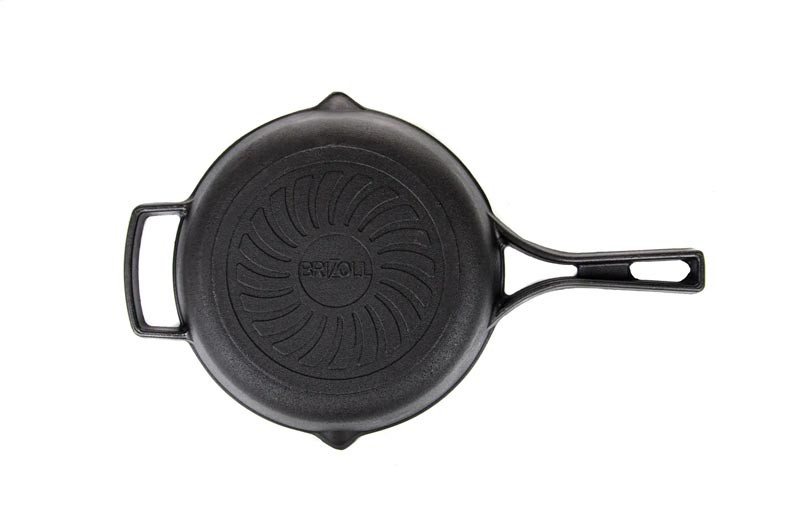 Велика чавунна сковорода з литою ручкою Brizoll M2660P із висотою стінки 65 мм. робить сковороду універсальною як для смаження, так і для гасіння, її можна використовувати на відкритому вогні.