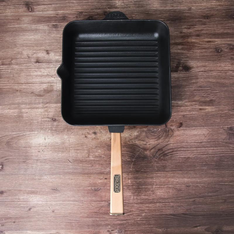 Квадратна сковорода гриль Brizoll виготовлена з литого чавуну, ручка виготовлена з вільхи. Чавунна сковорода може використовуватись з усіма видами плит.