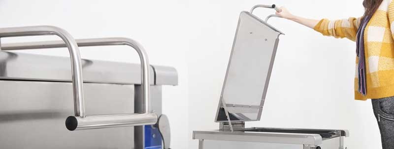 Робоча поверхня, кришка і панель управління виконані з нержавіючої сталі.