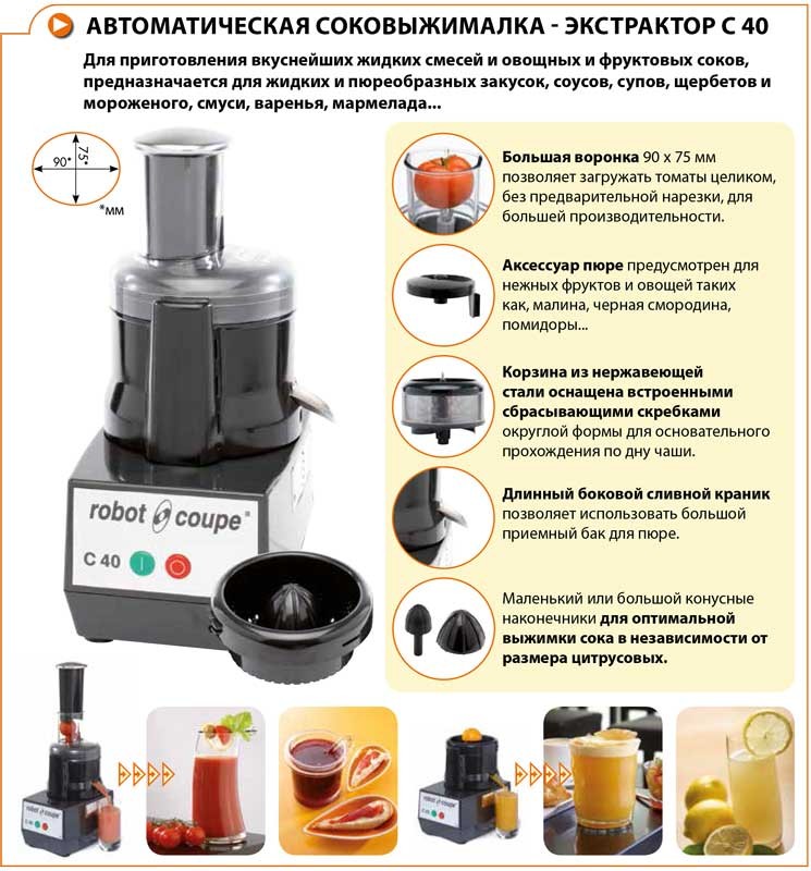 У буклеті Соковитискач Robot Coupe C40 висвітлено такі питання: застосування, технічні характеристики, опис, переваги