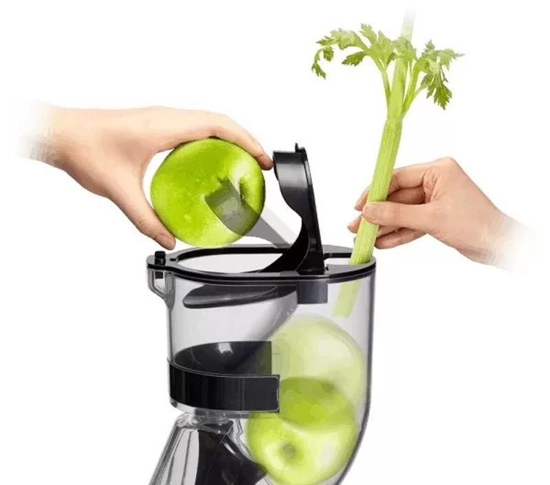 Простіше та зручніше. Нова O-подібна відкидна заслінка Whole Slow Juicer 5-го покоління ширша, ніж у існуючих моделей, для зручнішого приготування соку і має лише один вхід для подачі, що забезпечує зручність приготування соку.