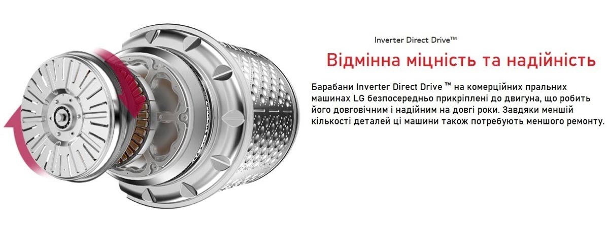 Двигун із прямим приводом Direct Drive – без приводного ременя, з частотним інвертором. Барабан безпосередньо з'єднаний з мотором, що забезпечує неперевершену довговічність та надійність.