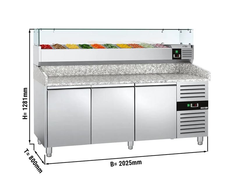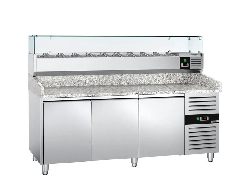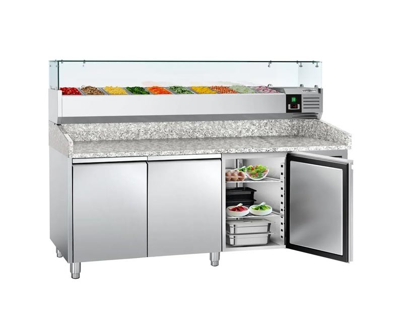Холодильний стіл для піци з вітриною надбудовою GGM Gastro POS208N#AGG203ND використовується для зберігання заготовок, необхідних для приготування піци. На гранітній поверхні готують красти та укладають начинку.