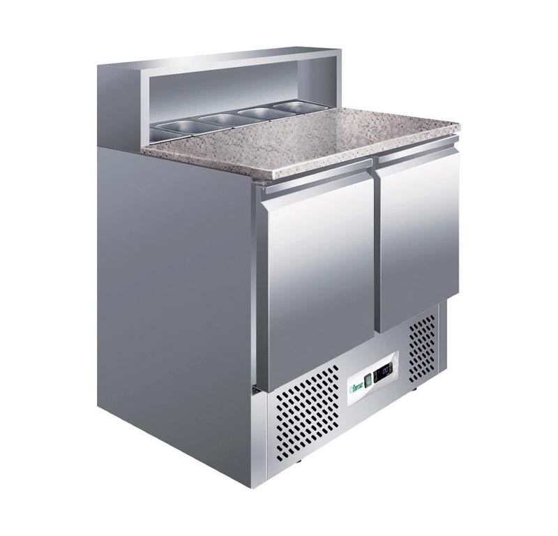 Холодильний стіл для піци з салатом-баром Forcar G-PS900 служить для зберігання заготовок, необхідних для приготування піци. На гранітній поверхні готують красти та укладають начинку.