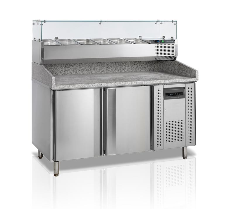 Холодильний стіл Tefcold PT1200 + VK38-150 з холодильною вітриною надбудовою служить для зберігання заготовок, необхідних для приготування піци. На гранітній поверхні готують краст і укладають начинку.