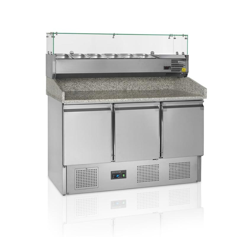 Холодильний стіл Tefcold PT1365 + VK33-140 з вітриною надбудовою служить для зберігання заготовок, необхідних для приготування піци. На гранітній поверхні готують краст і укладають начинку.