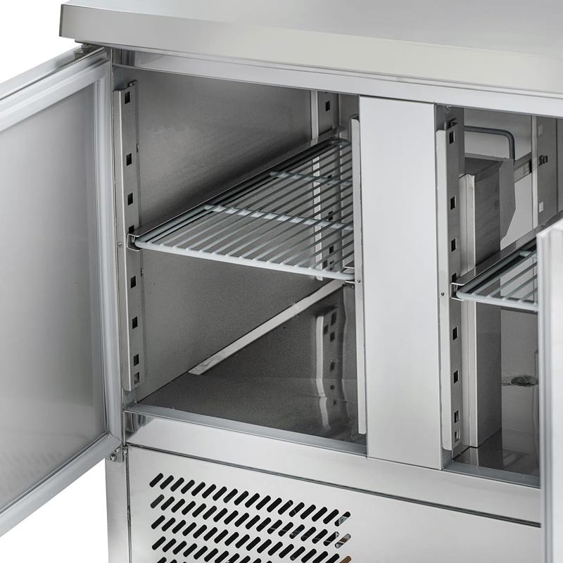 Професійний холодильний стіл Hurakan HKN-GXRC4GN – це високоефективне рішення для зберігання охолоджених продуктів та організації робочого простору на професійній кухні. Ця модель поєднує в собі функціональну робочу поверхню з нержавіючої сталі та місткий холодильний відсік – відмінне поєднання для ресторанів, кафе, кейтерингу, фаст-фуду та магазинів.