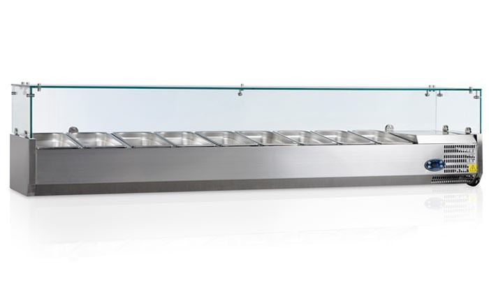 Настільна барна холодильна вітрина VK38-200 прекрасно підходить для короткочасного зберігання і демонстрації, попередньо охолоджених продуктів (салатів, закусок, гарнірів) в магазинах, кафе, барах, ресторанах, суші-барах. Найбільш широко застосовуються в піцеріях для зберігання начинки (начинки для піци).