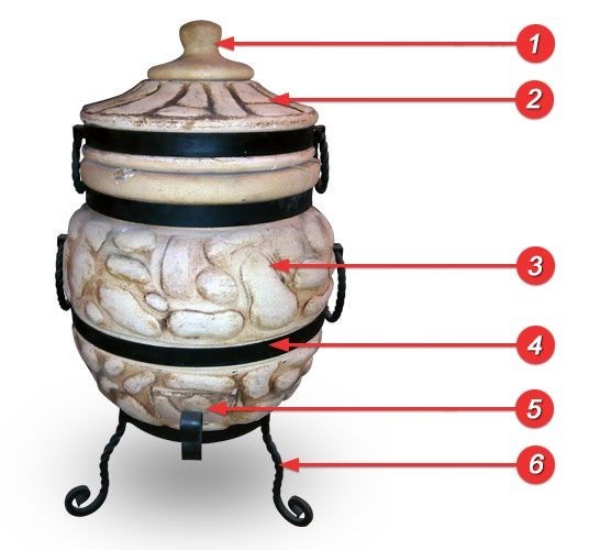 Пристрій тандира: 1. Мала кришка 2. Велика кришка 3. Корпус тандиру 4. окуттям 5. Піддувало 6. Ніжки