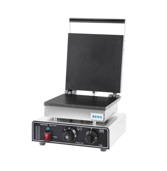 Модель оснащена механічним терморегулятором та таймером до 5 хвилин, що дозволяє точно контролювати процес приготування та отримувати стабільний результат. Вафельниця Berg SZ-209A має велику квадратну робочу поверхню, що робить її зручною для приготування плоских вафель, які легко згортаються в ріжки або трубочки для десертів та морозива.