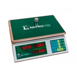 Торгова вага з печаткою етикеток. Пам'ять: 6000 товарів. Самообслуговування: 96 кнопок покупця. Похибка: 2/5 гр. Межа зважування: 15 кг.