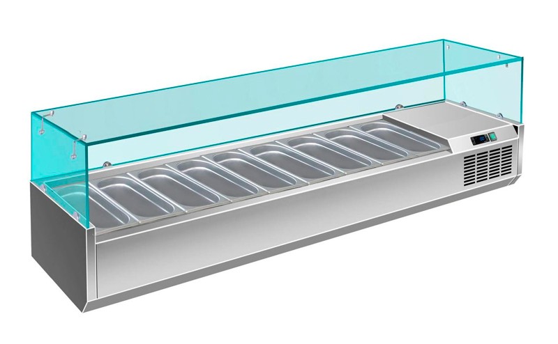 Настільна холодильна вітрина G-VRX2000 / 380 прекрасно підходить для короткочасного зберігання і демонстрації, попередньо охолоджених продуктів (салатів, закусок, гарнірів) в магазинах, кафе, барах, ресторанах, суші-барах. Найбільш широко застосовуються в піцеріях для зберігання начинки (начинки для піци).