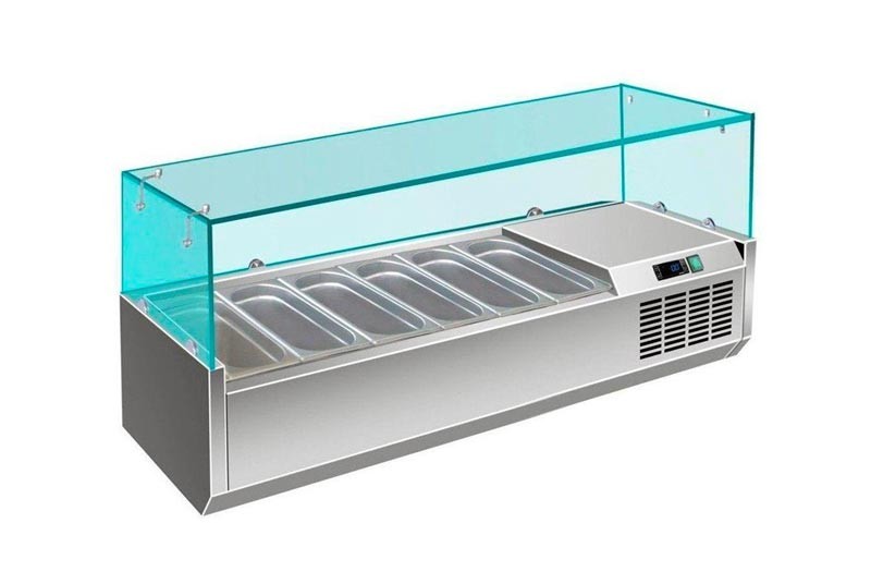 Настільна холодильна вітрина EFC VRX1400/330FG чудово підходить для короткочасного зберігання та демонстрації, попередньо охолоджених продуктів (салатів, закусок, гарнірів) у кафе, барах, ресторанах, точках продажу шаурми. Найбільш широко застосовуються в піцеріях для зберігання топінгу (начинки для піци).