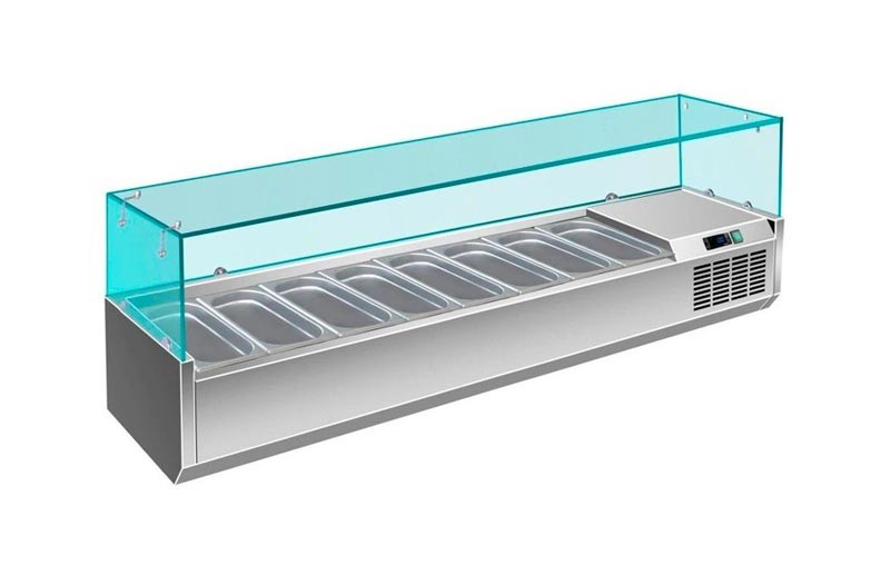 Настільна холодильна вітрина EFC VRX1800/330FG чудово підходить для короткочасного зберігання та демонстрації, попередньо охолоджених продуктів (салатів, закусок, гарнірів) у кафе, барах, ресторанах, точках продажу шаурми. Найбільш широко застосовуються в піцеріях для зберігання топінгу (начинки для піци).