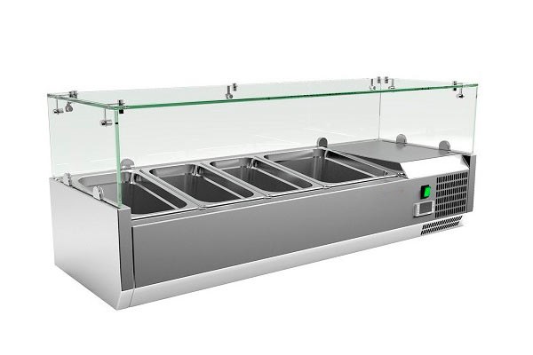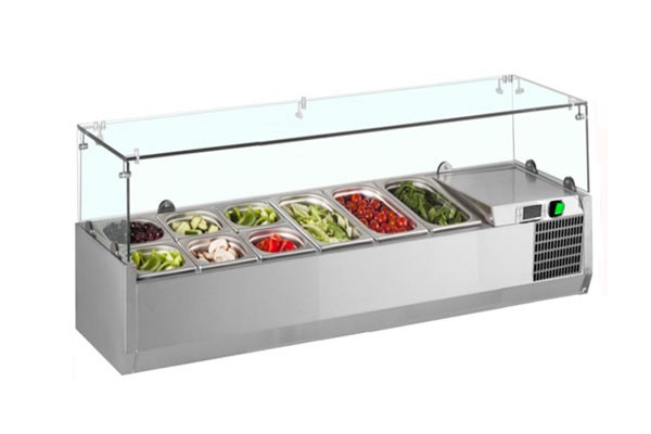 Настільна барна холодильна вітрина VRX1200/380 чудово підходить для короткочасного зберігання та демонстрації, попередньо охолоджених продуктів (салатів, закусок, гарнірів) у магазинах, кафе, барах, ресторанах, суші-барах. Найбільш широко застосовуються в піцеріях для зберігання топінгу (начинки для піци).