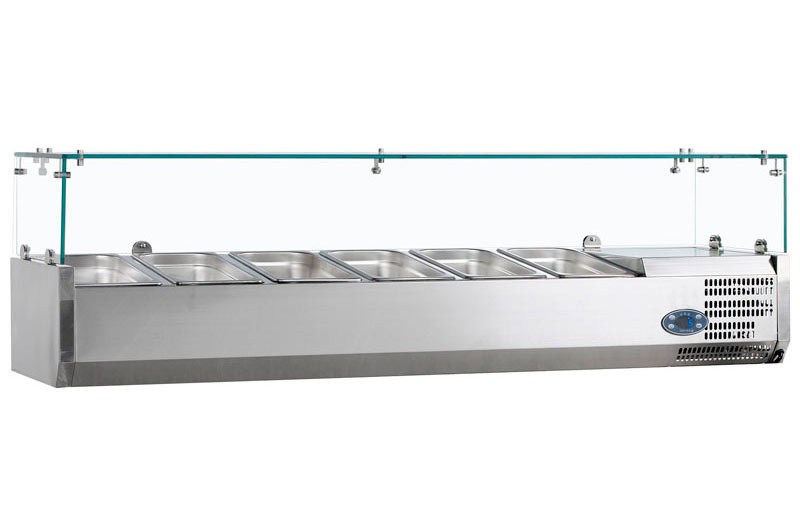 Настільна барна холодильна вітрина VK38-150 прекрасно підходить для короткочасного зберігання і демонстрації, попередньо охолоджених продуктів (салатів, закусок, гарнірів) в магазинах, кафе, барах, ресторанах, суші-барах. Найбільш широко застосовуються в піцеріях для зберігання начинки (начинки для піци).